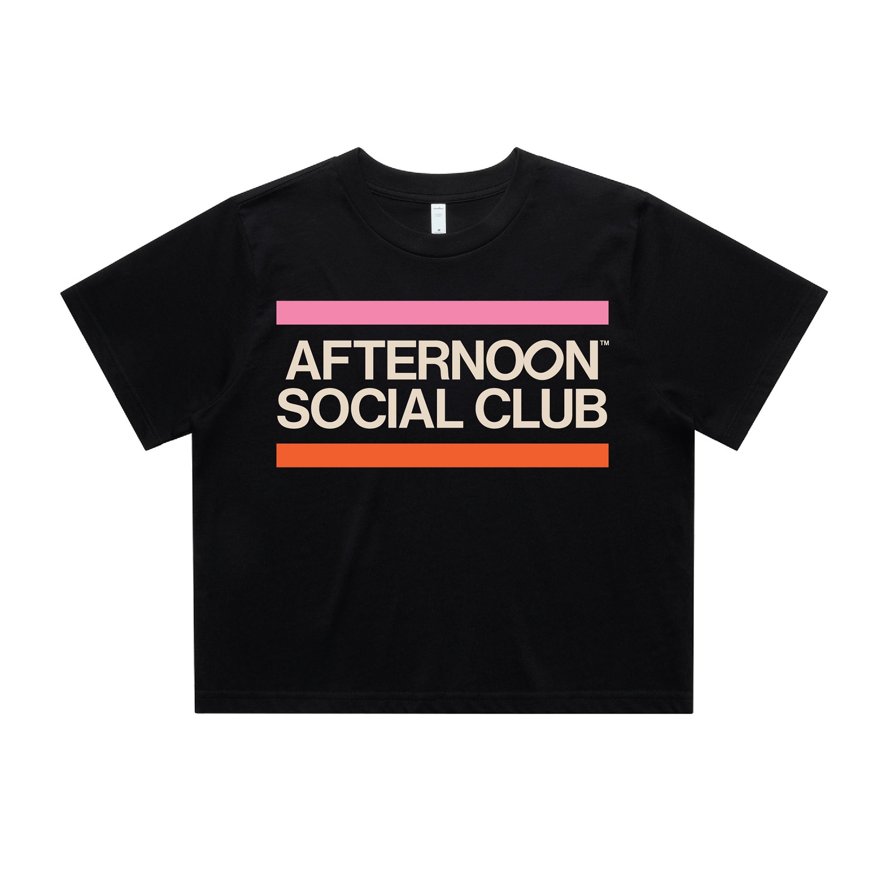 The Afternoon Social Club Crop top, crafted from 100% carded cotton for durability and comfort. With a heavy 240 GSM weight and garment dyed finish, it features a cropped relaxed fit, shoulder to shoulder tape, and twin-stitched wide neck ribbing. Built to last for a timeless, relaxed look.