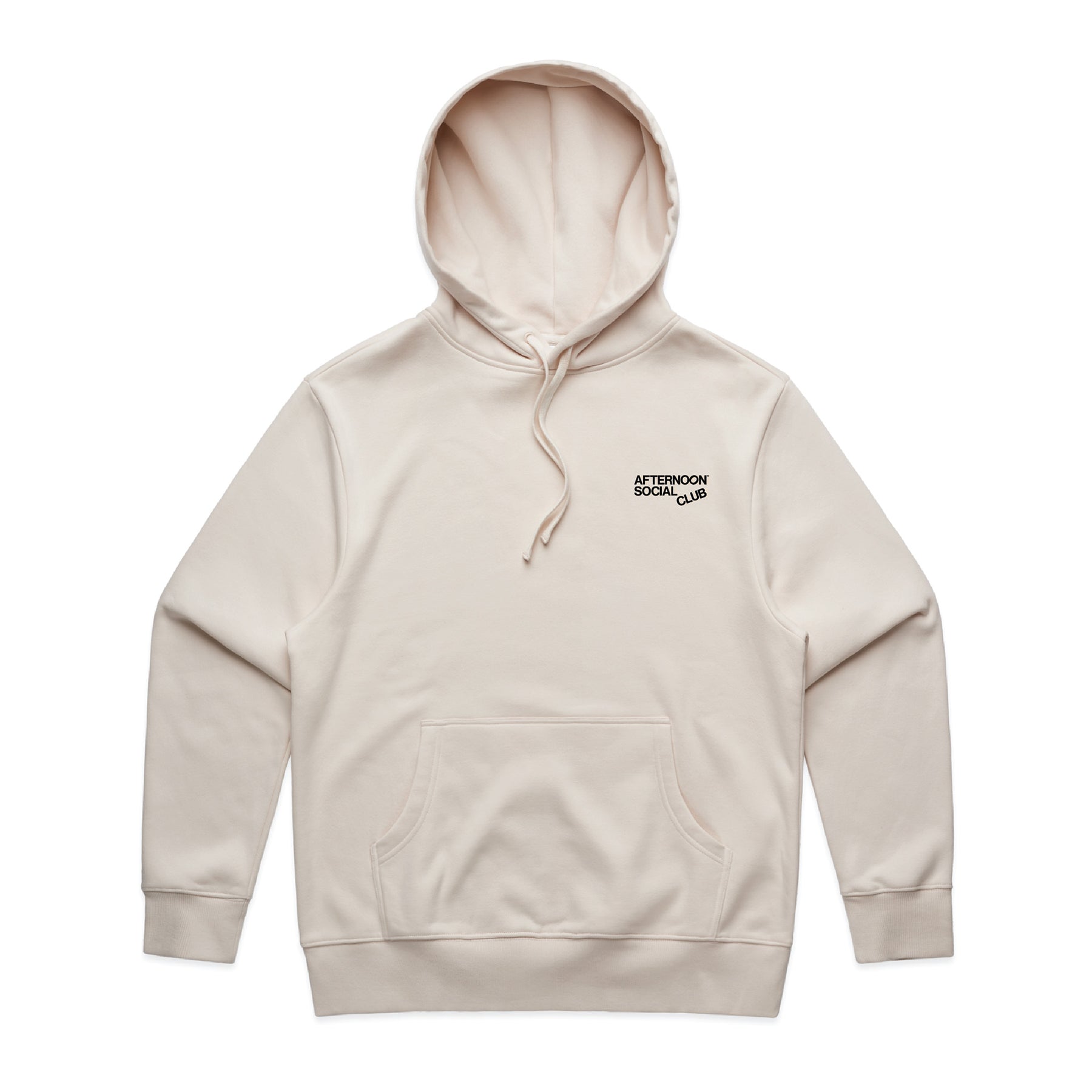 Ecru heavy hoodie from Afternoon Social Club featuring logo, oversized fit, and durable cotton fabric.