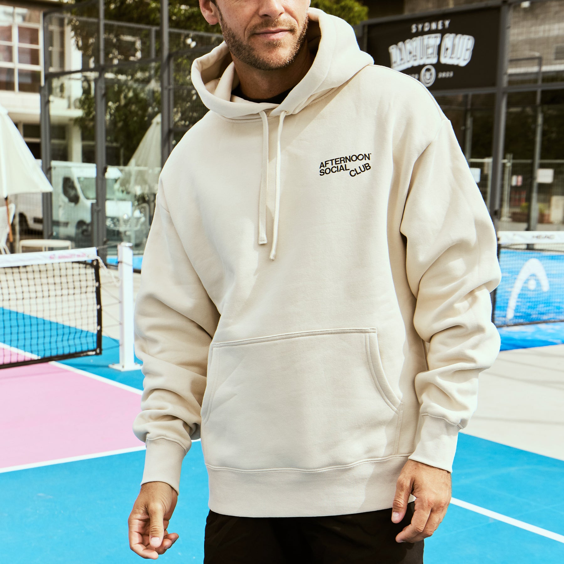 Man wearing Afternoon Social Club heavy hoodie in Ecru.