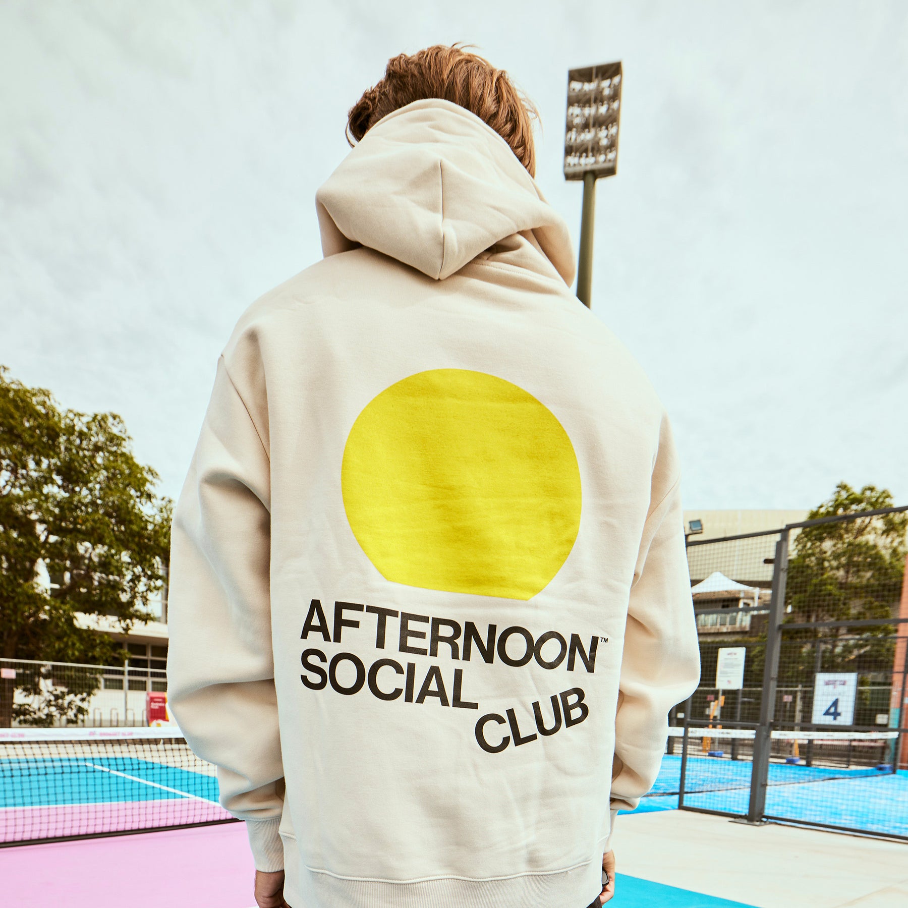 Ecru heavy hoodie with yellow sunset circle and Afternoon Social Club lettering on back.